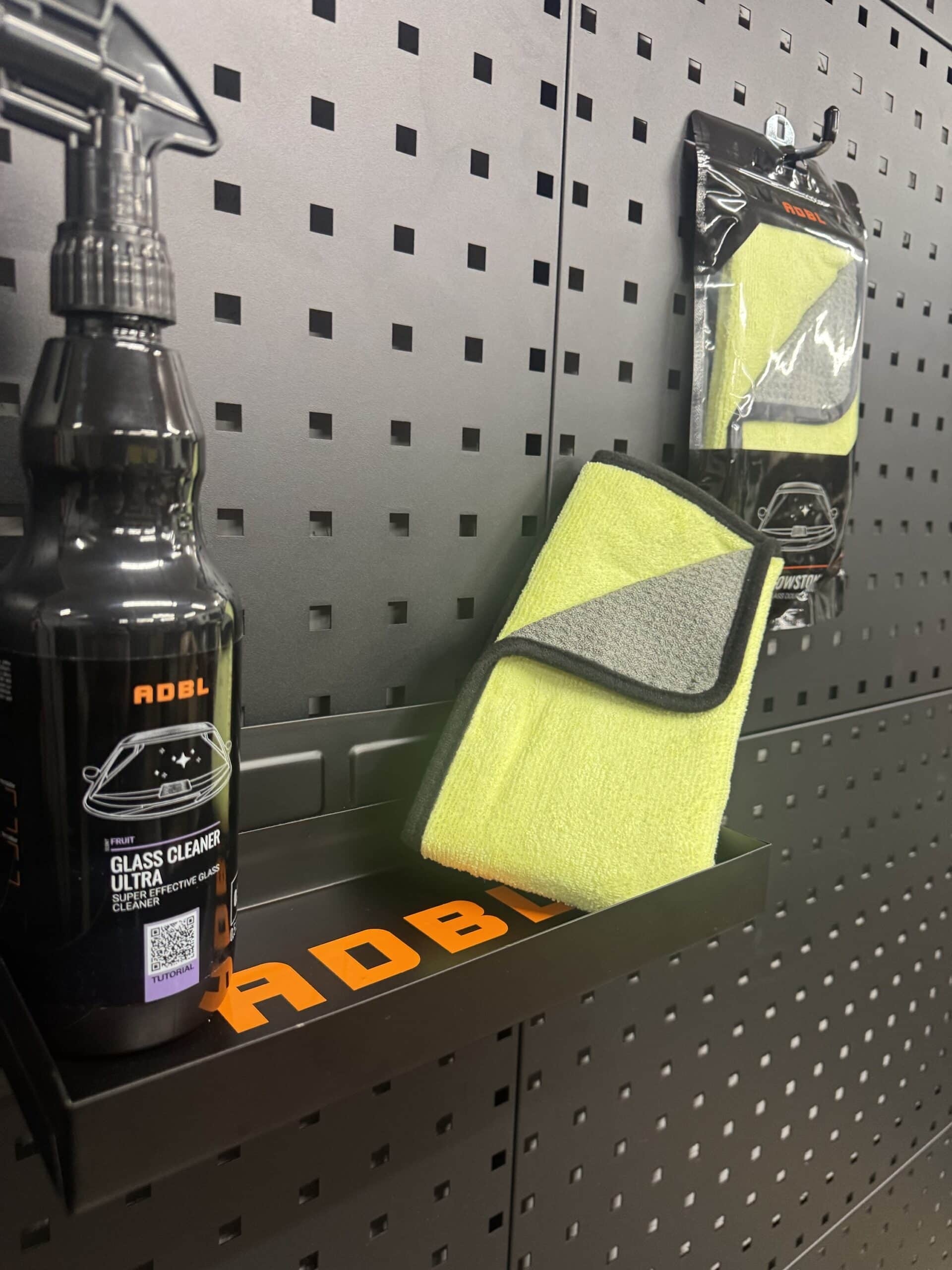 - Spray ADBL Glass Cleaner Ultra direkte på glasoverfladen eller på kluden.