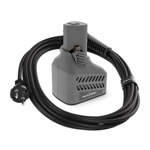 Adapteren er kompatibel med chemicalworkz® Evo Mini fra version 04/2025 (med det nye batteristik) samt med DA12 EVO. Den fungerer også med alle andre chemicalworkz-maskiner, der har samme stik. På den måde kan du nemt køre din maskine på fast strøm uden at skulle bekymre dig om batteristatus.