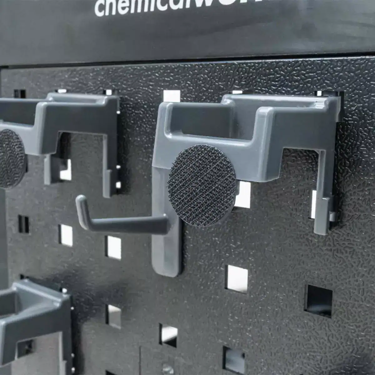 - Flasker og tilbehør på siden: ChemicalWorkz-vognen har forbedrede holdere til flasker og tilbehør på siden. Det giver bedre organisering og nem adgang til det, du bruger mest.