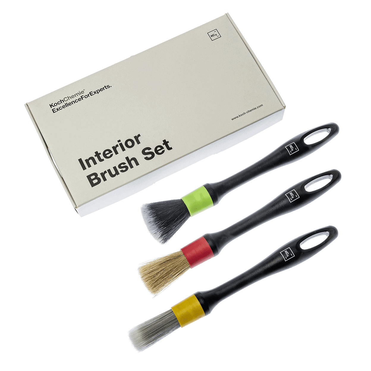 Det innovative børstesæt kombinerer den sædvanlige høje kvalitet af Koch s indvendige bilplejeprodukter med deres specialudviklede børster til indvendig rengøring. Sættet består af tre børster, som takket være deres forskellige anvendelsesmuligheder tillader ukompliceret rengøring af dit køretøjets interiør. For den nemmest mulige håndtering er de tre børster farvekodede fra hinanden. Den røde børste er ideel til rengøring af karmlister, fodpedaler eller til andet hårdt arbejde/plastik. Den gule børste er det rigtige valg til finere arbejde, såsom rengøring af ventilationsgitteret, og skinner her især på grund af sine finere børster. Men når det kommer til særligt fint arbejde, såsom rengøring af displays eller pianolak, arbejder deres grønne børste med den fornødne omhu på grund af sine særligt fine børster og sikrer dermed rengøring uden risiko for ridser. Især i kombination med koch s produkter, såsom multirengøringsmidlet, bliver indvendig rengøring en leg.